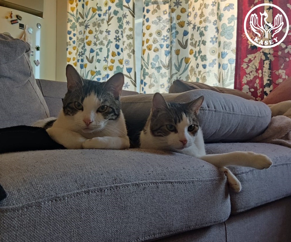 Olemme Myh ja Jasmiina, seuralliset kissakaverukset. Rakastamme silityksiä ja huomiota. Jasmiina on ensin varautunut vieraissa paikoissa. Emme soveltuneet talouteen, jossa oli muita kissoja. Stressin takia teimme tarpeita vääriin paikkoihin mutta olimme sisäsiistejä ollessamme talouden ainoat kissat. Jasmiinalla on vielä edessä hammasremontti ennen uuteen kotiin muuttoa. Ihannekotimme on rauhallinen talous, jossa ei ole muita eläimiä. Etsimme yhteistä kotia. Olemme FIV/FeLV negatiivisia. Olemme nähtävillä eläinsuojelukeskuksella Lappeenrannassa sopimuksen mukaan ja meitä voi tiedustella p. 050 3310 689 tai kasey.adoptio(at)gmail.com