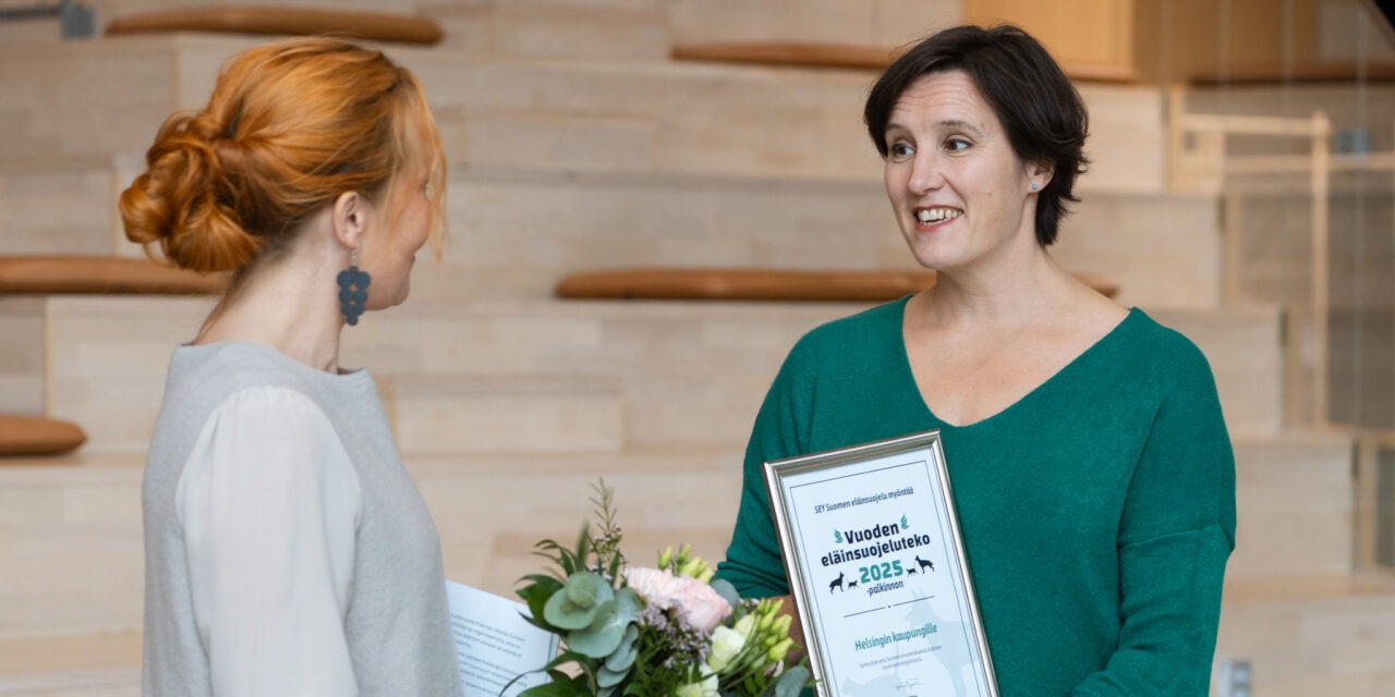 Vuoden eläinsuojeluteko 2025 -palkinto Helsingin kaupungille eläinten hyvinvointiohjelmasta